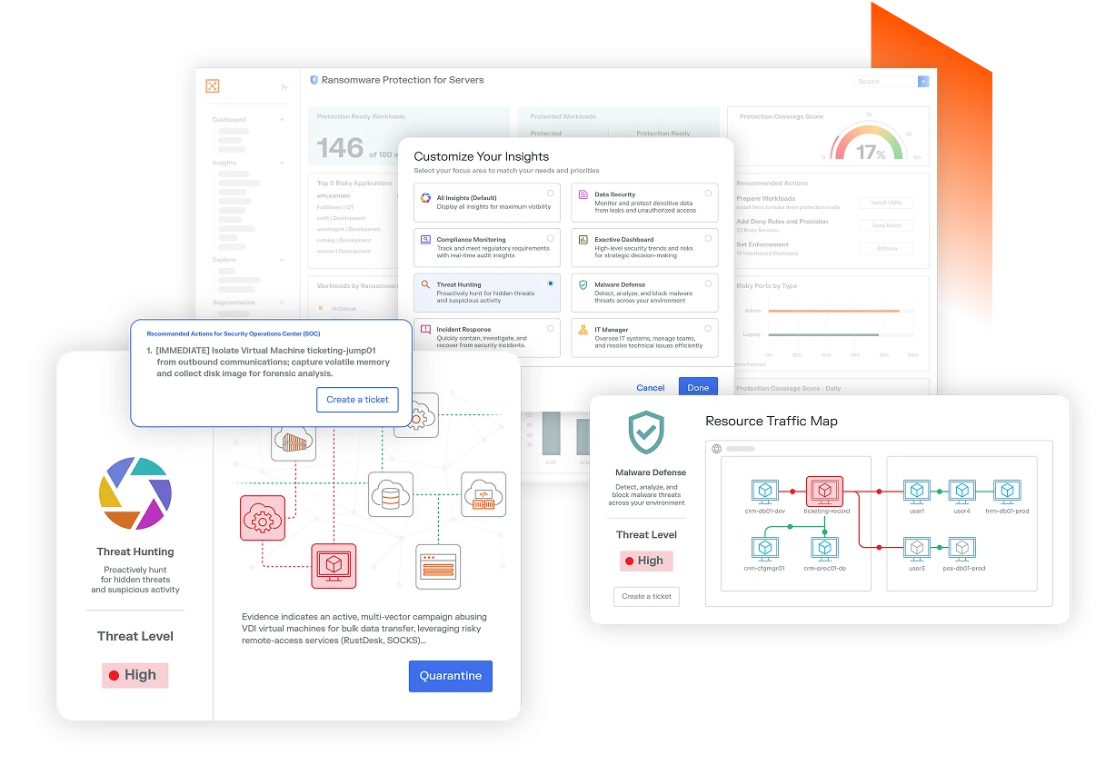 Proteja los activos, las cargas de trabajo y los dispositivos que son fundamentales en su entorno híbrido y multinube. Observe el riesgo, establezca políticas y prevenga el movimiento lateral con el líder probado en microsegmentación.